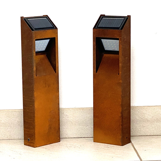 Lámpara de jardin solar oxido natural corten. Potente Baliza o bolardo de exterior con sensor de movimiento. Sin cables. Luz blanco cálido.