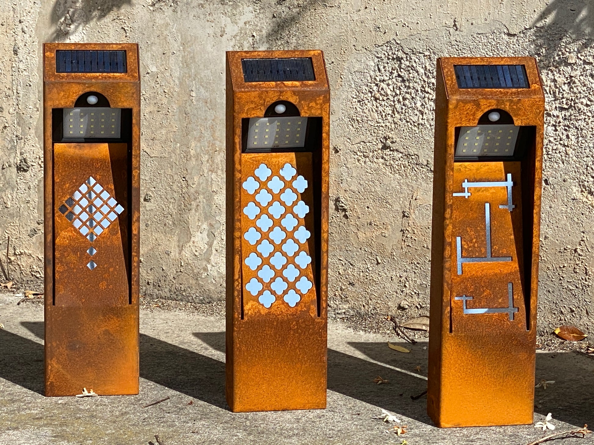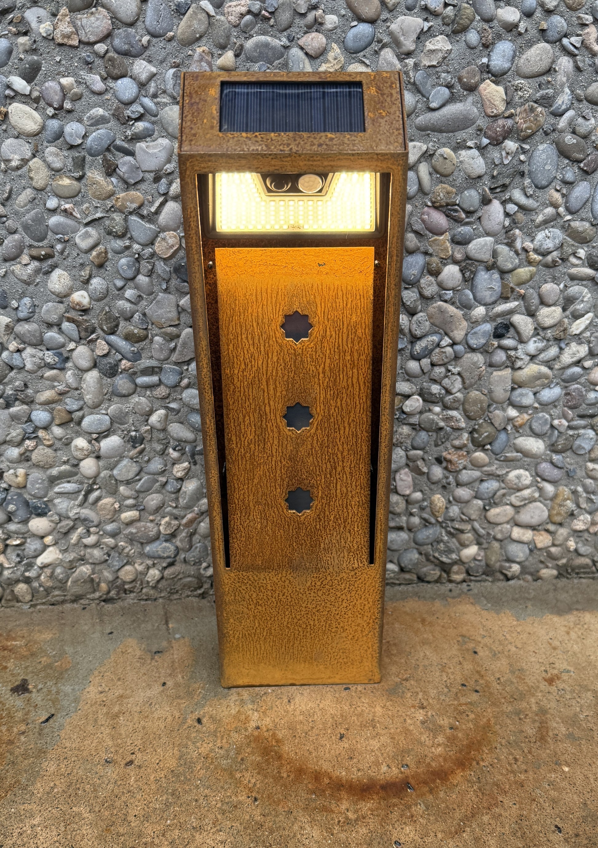 Lámpara de jardin solar óxido natural. Baliza o bolardo de exterior con sensor de movimiento. Libre de cables. Luz blanco cálido.